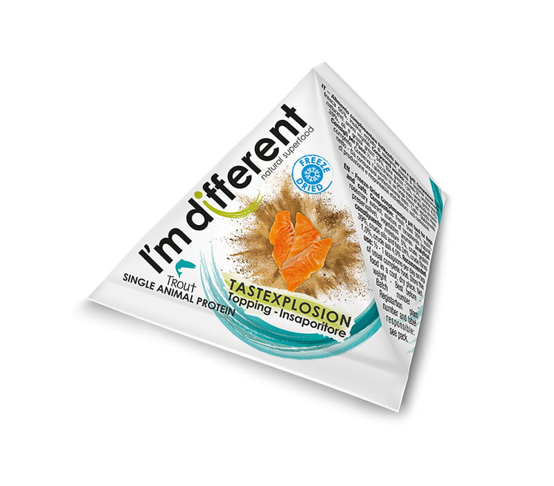 I’m different eksplozja smaku. Liofilizowana posypka (topper) z pstrąga z jednego białka zwierzęcego dla psów i kotów. Pozyskiwane we Włoszech z ponad 95% surowego i świeżego pstrąga, jakości human grade.