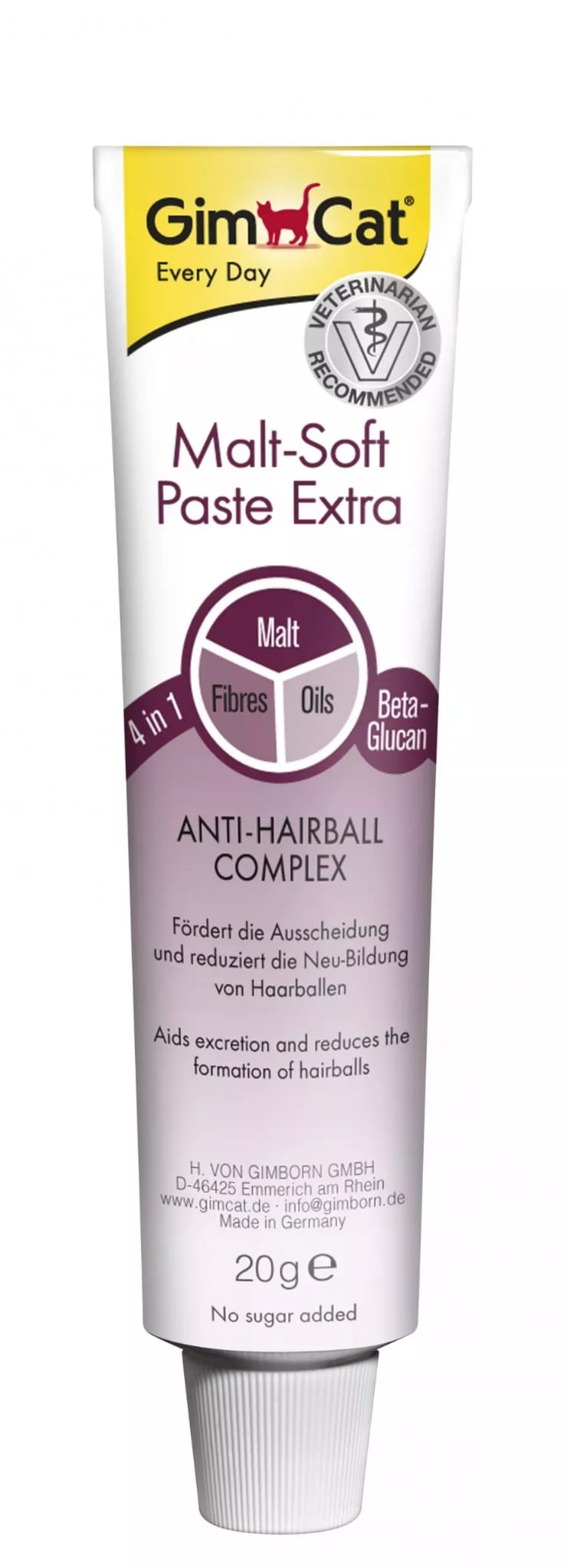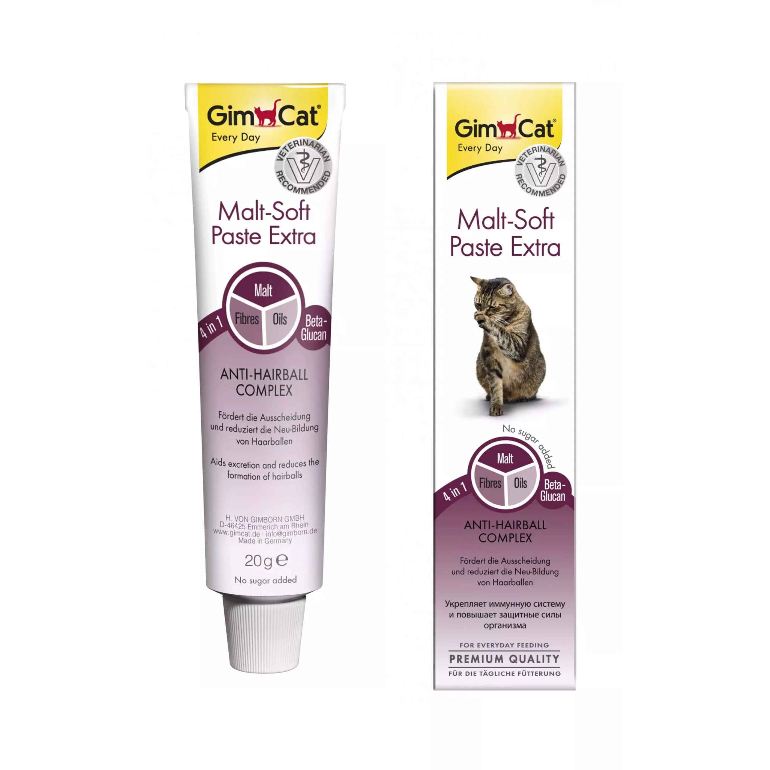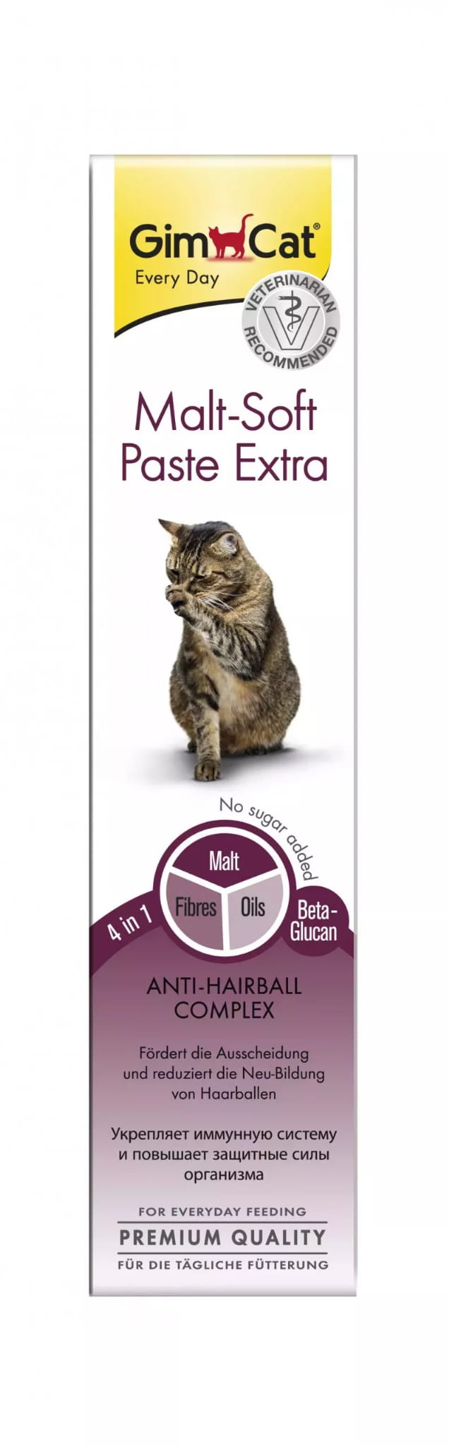 GimCat Malt-Soft Extra zawiera czysty, aromatyczny słód i olej roślinny. W połączeniu z błonnikiem pokarmowym Malt-Soft Extra wspomaga przepływ pokarmu, naturalne przepuszczanie połkniętych włosów i innych niestrawnych składników.