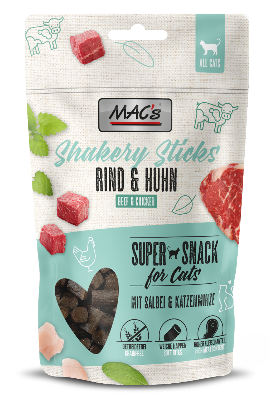Shakery Sticks Beef & Chicken firmy MAC oferują Twojemu kociemu przyjacielowi wyjątkowe połączenie mac. Pełne świeżego mięsa, te bezzbożowe pałeczki idealnie nadają się do treningu klikerowego i jako smaczna przekąska między posiłkami. Dobroczynne superfoods, szałwia i kocimiętka, wspomagają trawienie i działają uspokajająco, pomagając Twojemu kotu przetrwać codzienne sytuacje i stres. To naprawdę super przekąska dla Twojego kota!