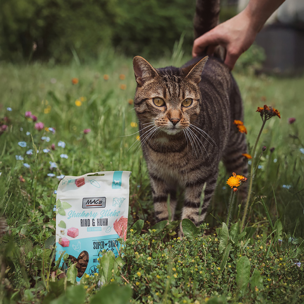 Miękkie przekąski dla małych smakoszy: MAC's Shakery Sticks Wołowina & Kurczak oferują twojemu kotu wyjątkowe połączenie smaków. Dzięki dużej zawartości świeżego mięsa bezzbożowe patyczki świetnie sprawdzają się podczas treningu z klikerem oraz jako przekąska między posiłkami. Pożyteczne superfoods – szałwia i kocimiętka – mogą wspierać trawienie i dodatkowo działać uspokajająco. Mogą więc pomóc twojemu kotu na co dzień oraz w stresujących sytuacjach. To prawdziwa superprzekąska dla twojego mruczka!