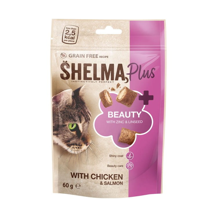 Shelma BEAUTY Przekąska dla kota z kurczakiem i łososiem 60g